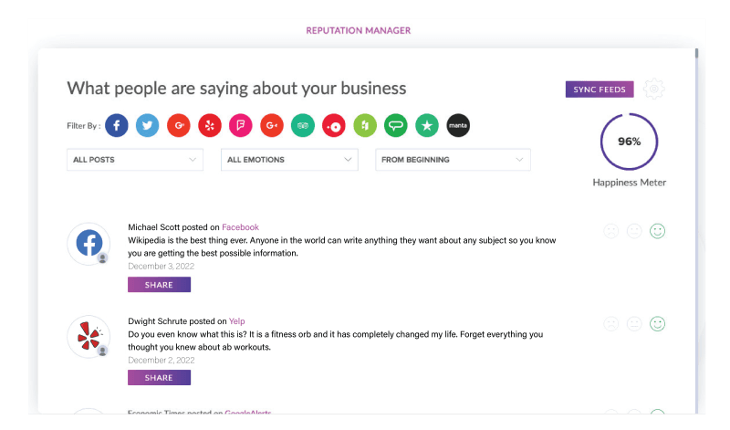 A.I. identifies the sentiment of each comment and gives you a happiness Score. See how you’re doing online with a single look. Filter your feed so that negative comments that require your attention always appear on top.